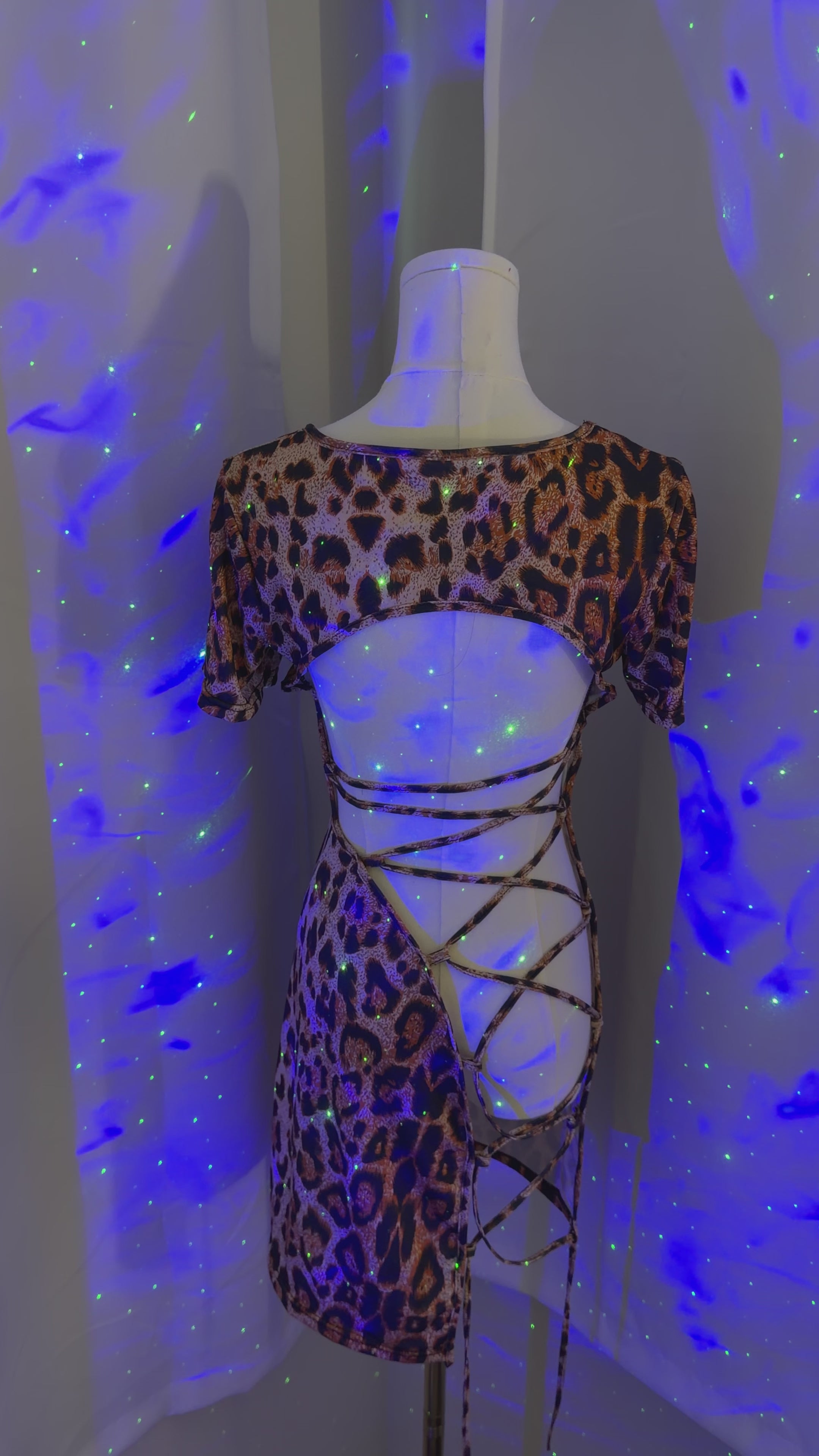 | Bold leopard print with statement side lace-ups. A body-hugging, short-sleeve mini dress with deep neckline and crisscross ties from waist to thigh. Soft stretch knit; matching thong included. What’s Included: Leopard cutout mini dress Matching thong Color: Leopard Print Fit & Sizing: One Size; best for XS–M Stretch fabric with adjustable side ties |